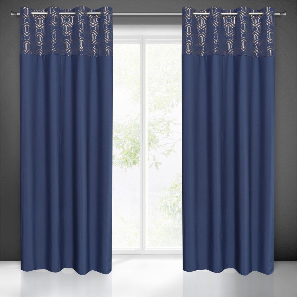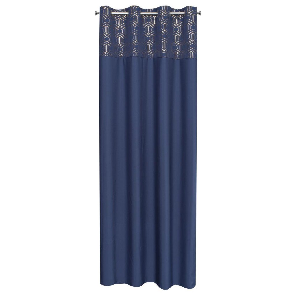Elegantní jednobarevný modrý závěs DAFNE se zajímavým zlatou geometrickou potiskem v horní části. Šířka: 140 cm, délka: 240 cm. Složení: 100% polyester, gramáž: 140 g / m2. Praktické zavěšení na kovové kroužky.
