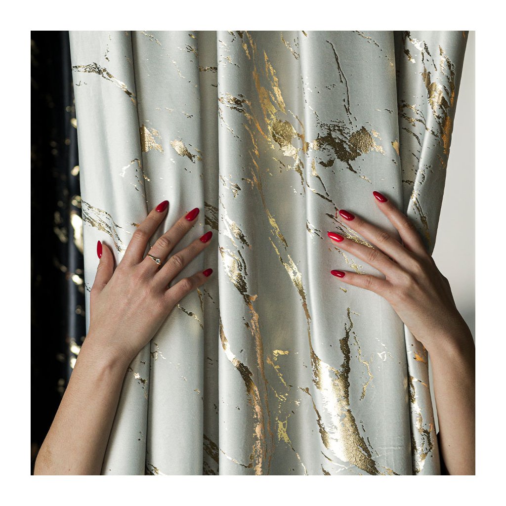Luxusní pastelově šedý sametový závěs MARMA se zlatým potiskem je dokonalým spojením elegance a moderního stylu. Jemný samet s jemným leskem vytváří příjemnou atmosféru a působí mimořádně sofistikovaně. Zlatý vzor na povrchu dodává prostoru výrazný, ale stále vkusný akcent , který zaujme na první pohled.