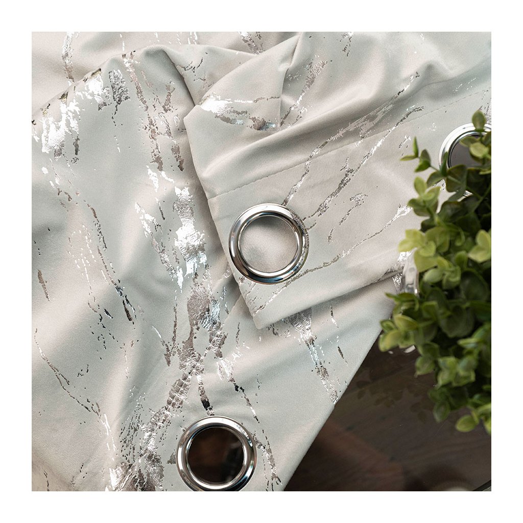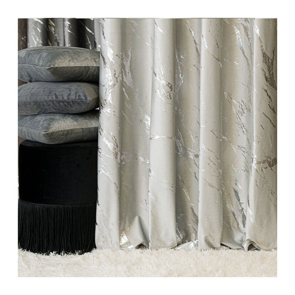 Pastelově šedý sametový závěs se stříbrným potiskem na kroužcích MARMA 140x250 cm