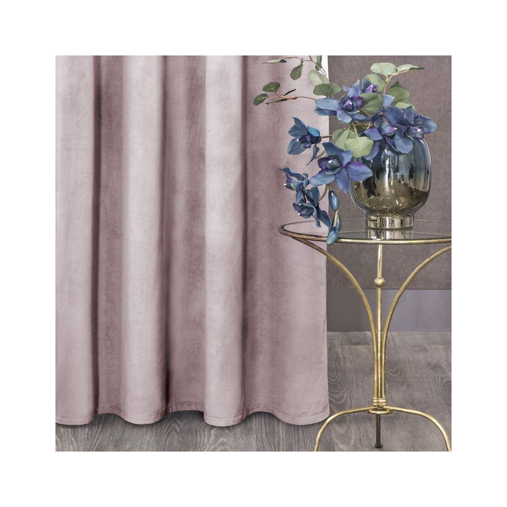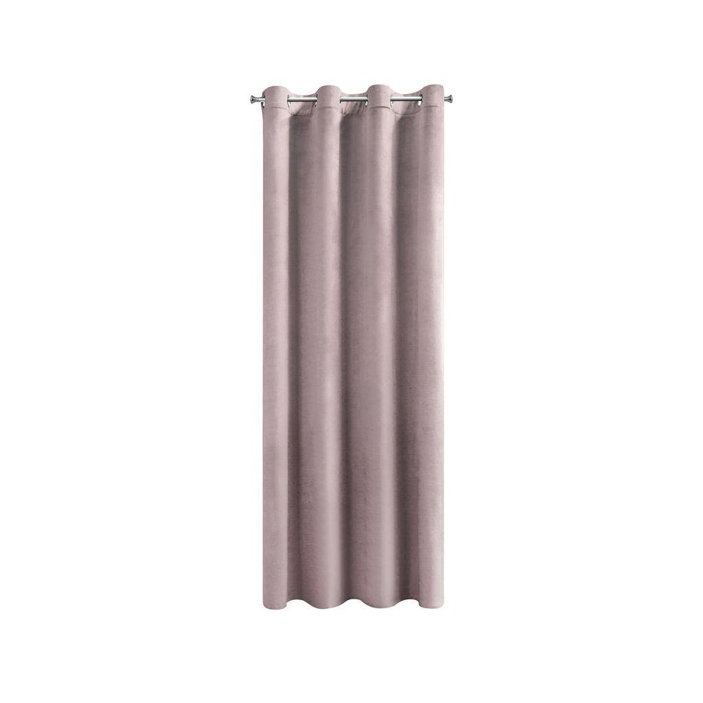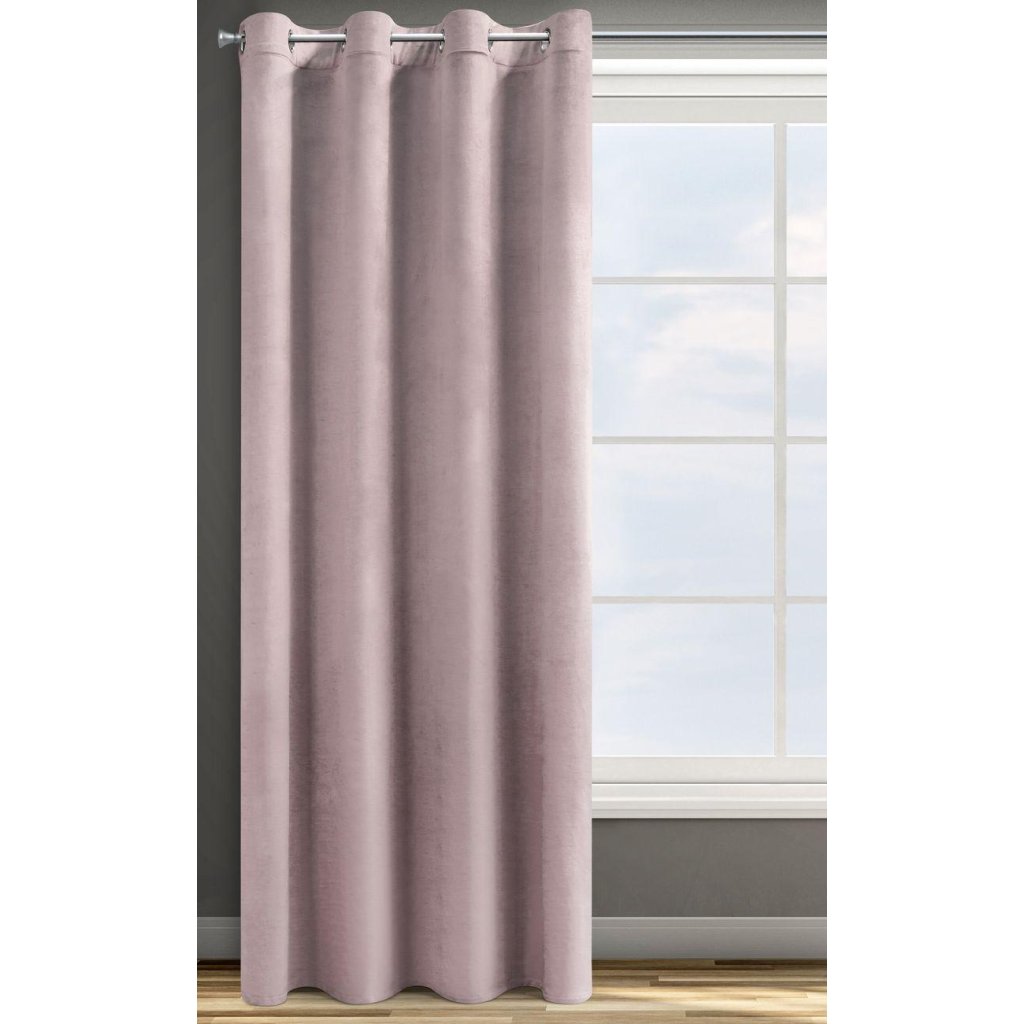 Sametový jednobarevný pudrový závěs . Sametová látka o hustotě 200g/m2 poskytuje střední stupeň vnitřního zatemnění . Šířka: 140 cm, délka: 250 cm. Složení: 100% polyester. Praktické zavěšení na kovových kroužcích .