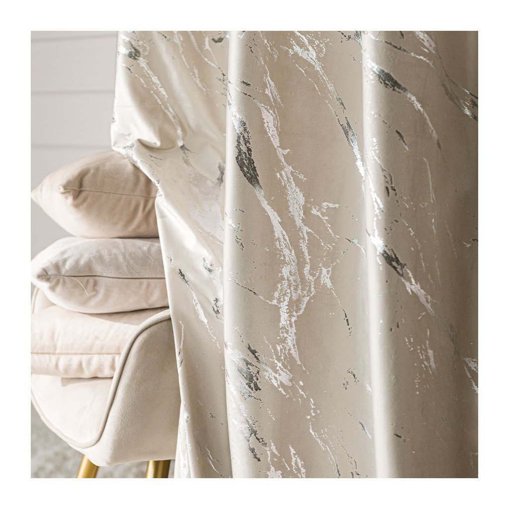 Světle krémový sametový závěs MARMA se stříbrným potiskem