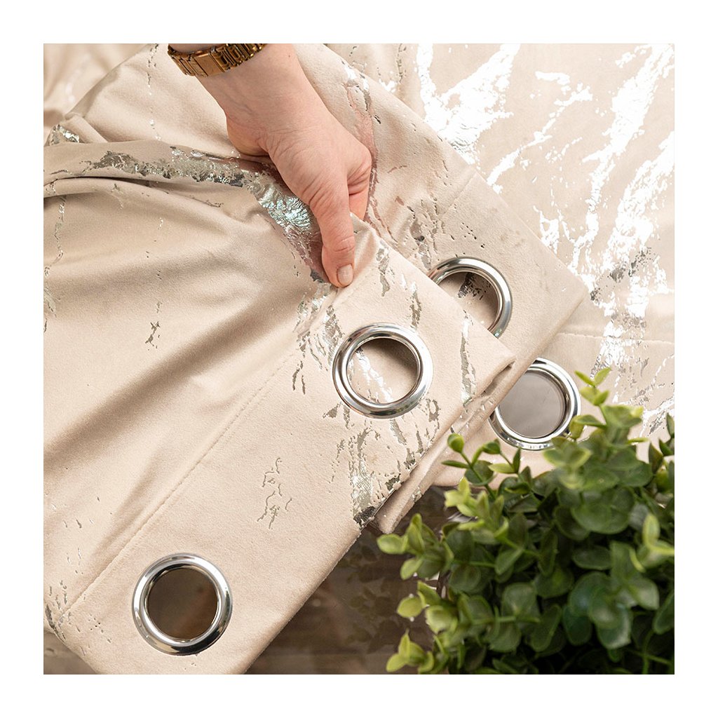 Světlobéžový sametový závěs se stříbrným potiskem na kroužcích MARMA 140x250 cm