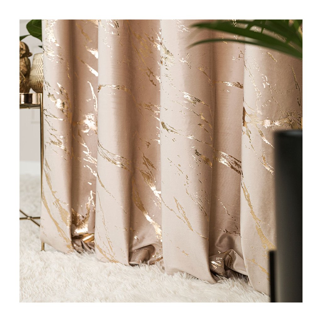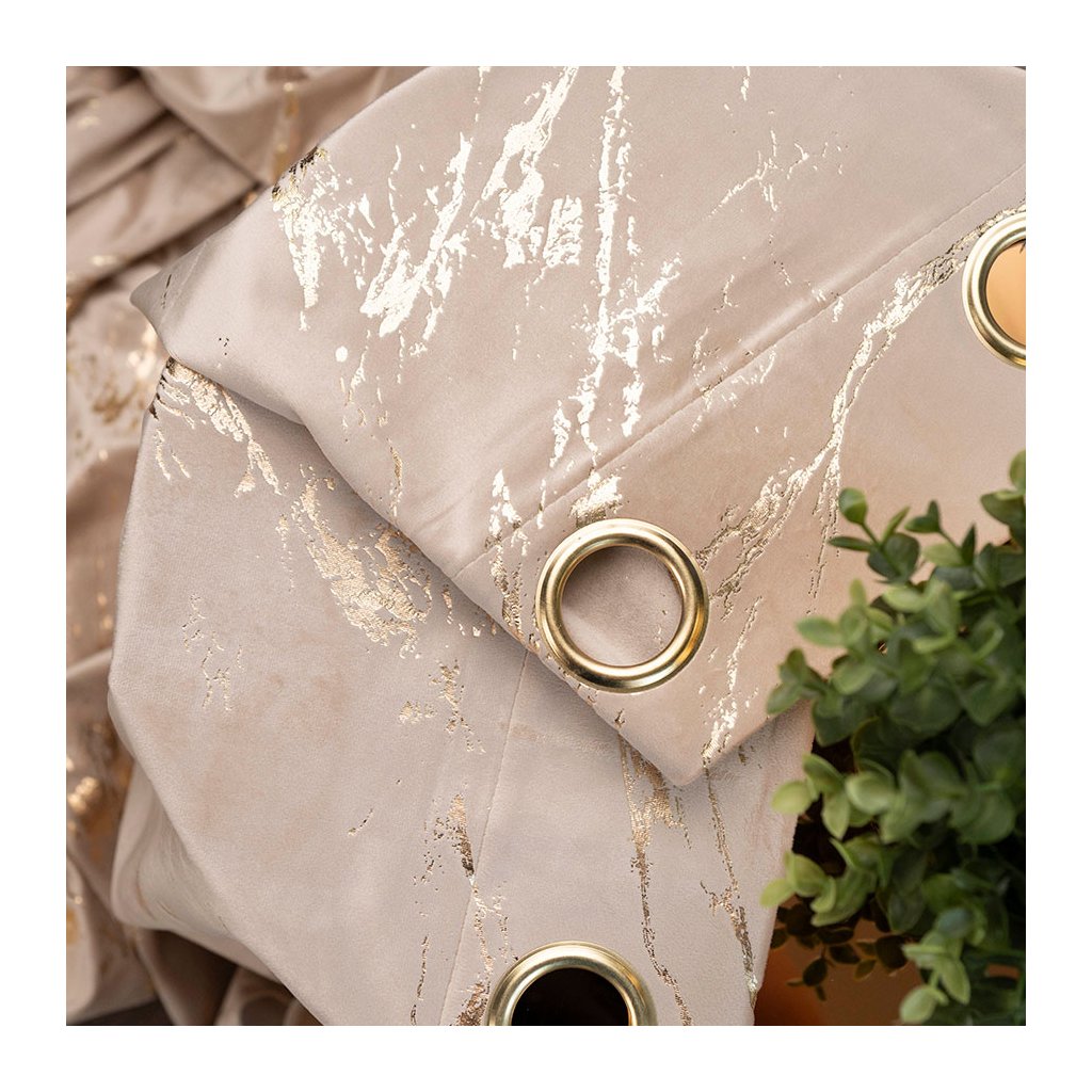 Světlobéžový sametový závěs se zlatým potiskem na kroužcích MARMA 140x250 cm