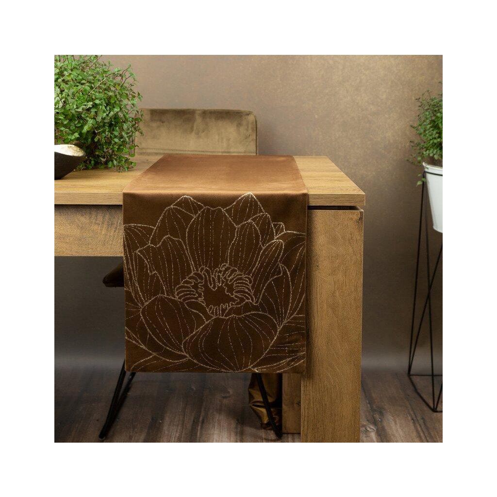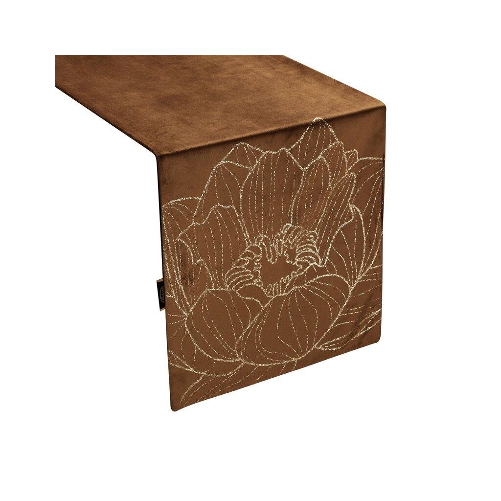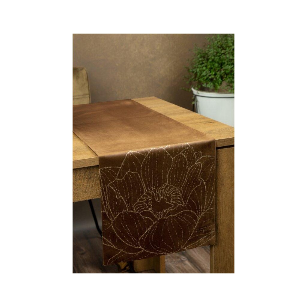 Tmavě hnědý sametový běhoun na stůl BLINK13 s květinovým vzorem 35x220 cm