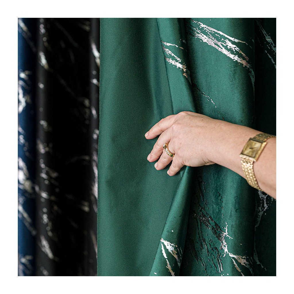 Luxusní sametový závěs MARMA s metalickým mramorovým potiskem propojí eleganci a moderní styl . Hustě tkaný samet krásně splývá, má jemný noblesní lesk a na okně vytváří galerijní efekt – výrazný, ale stále vkusný akcent.